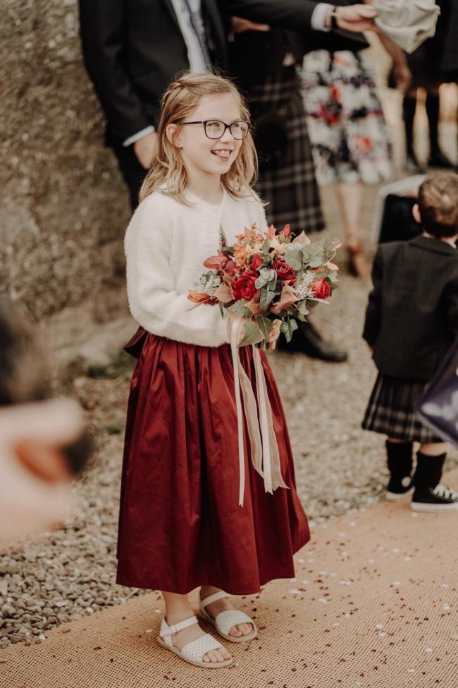 Craig opted for a grey granite tartan with a red pinstripe through it which matched beautifully with the flower girls’ red striped dresses.