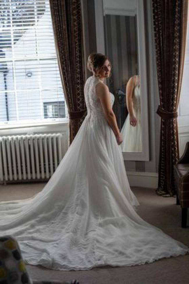 Shopping for my bridal outfit was nerve-wracking but stumbling upon ‘The One’ at a sample sale was an absolute delight. The gown made me feel like a queen so I knew it had to come home with me then and there! I complimented it with sentimental accessories like a necklace Ryan had gifted me anda bracelet from my mum.. Alterations were a must, being a petite 5'2" lass who’d planned to wear Converse beneath my dress!